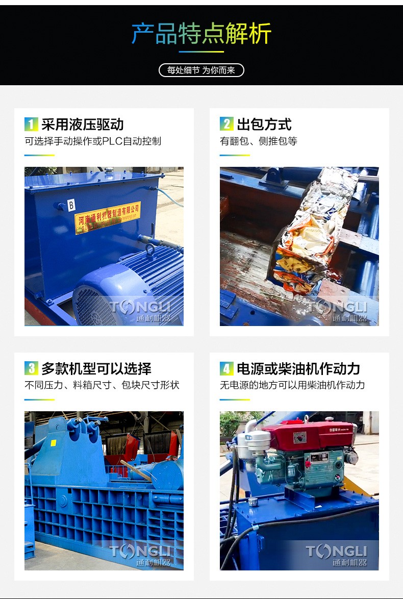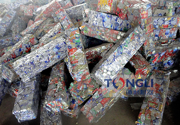 將打包物料置于打包機料箱內(nèi),液壓油缸工作打壓,將打包物料壓縮成型,壓制成各式金屬包塊。