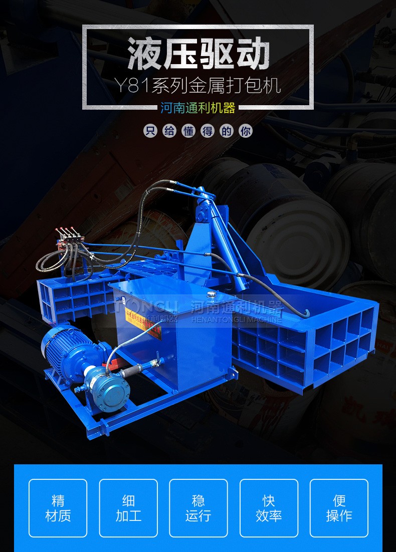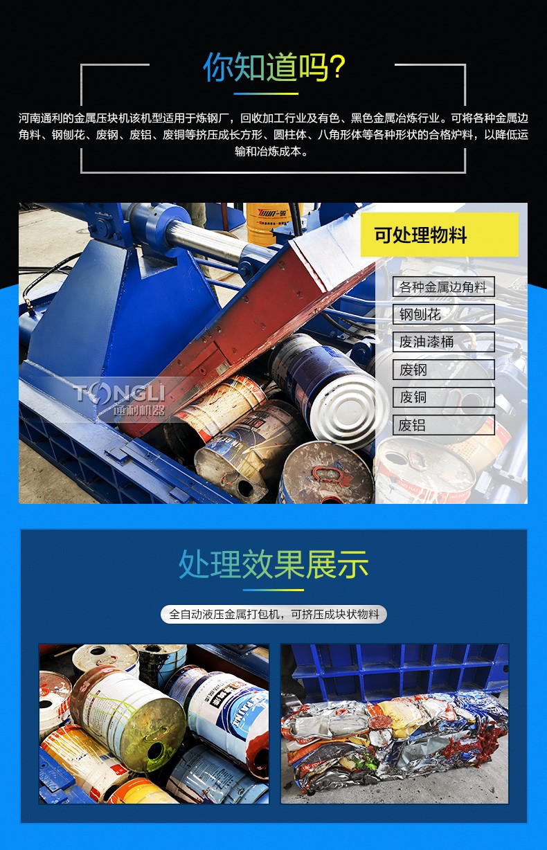 金屬打包機可將各種金屬邊角料、鋼刨花屑、廢鋼、廢鐵、廢銅、廢鋁、鋁刨花屑、解體汽車殼、廢油桶等金屬原料擠壓成長方體、圓柱體等各種形狀的合格爐料。便于儲藏、運輸及回爐再利用。