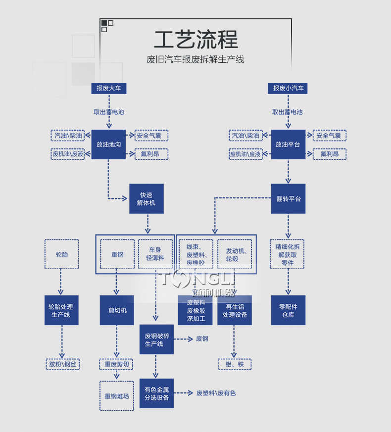雙軸撕碎機對物料進行預破碎處理,立式撕碎機進行二次破碎并壓實至50-80mm,并清潔表面的油漆和污垢。經處理后,物料堆積密度適合直接運輸。與傳統的粉碎設備相比,廢舊汽車拆解生產線在設備,維護成本方面具有非常明顯的勢。